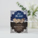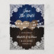 Romantiska jetflottans blåa bröllop spara datum-vykort med två burlap-hjärtan på en lada-bakgrund med strängen ljus och vit blommigt snöre.