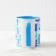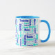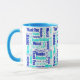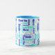 Tack för den första kopp av din favoritdryck varje morgon? tack här i mugg designat med mitt blåa och turkosa flerspråkiga "Tack"-moln i ord i en mängd typsnitt över vitt.