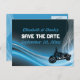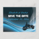 Blå vägbiker bröllop Spara datum vykort, med en motorcykel på en abstrakt gradient blå, vit, svart bakgrund och ett vitt nät. Vissa element tillhandahålls av Clipartandfonts.com.