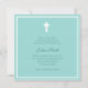 Religiös blå inbjudan med en yttre vit kant och ett vitt kors. © Mood 4 Cute