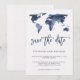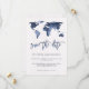 Detta chic, moderna bröllop spara datum-kort har en vit, vattenfärg-papper utseende bakgrund med en trendig blå vattenfärg världskarta och matchande text. Perfekt för bröllopet för alla par som älskar att resa, eller någon som har ett destinationbröllop.