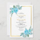 Blåblommor och bröllopsinbjudan till blommigten guld ram. I den här eleganten visas en guld ram och akvablått vattenfärg, blommor och löv i hörnen på den övre lämnat högerna och i grund och texten i guld och svart.