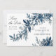 Intressant, modernt och elegant bröllop sparar datuminbjudan med blå indigo-blommor och löv i vattenfärg. Lättfärgade blommigtar med konturer. Ett unikt kort med vågräts utformning. Färg-systemet gör kortet lämpligt för ett vinterbröllop.