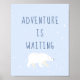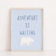 Den blå vintern snö med funktionstecknet "Äventyr väntar", naturutforskandet och äventyr polar bär daghem för perfekt, barnrum, sovrum, lekrum och annat rum. personlig och monogram och bakgrund färg. Könsneutral design för både pojkar och flickor.