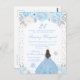Denna eleganta och glamourösa vinterfödelsedagsinbjudan visar en vacker prinsessa med brunett hår och ljus hy i en blå balklänning. Texten kombinerar handskriven skrift och moderna sans serif-teckensnitt för en klassisk och sofistikerad look. De blomsterarrangemang, snöflingor och silverkonfetti skapar den perfekta blandningen av rustik och chic.