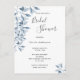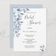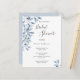 Ett trendig inbjudningskort för möhippan i vitt och dammblått. En vit chic på framsidan. Dekorerad med botaniska blåa färgader och löv. Modern stor, hanterad text, typografi med texten: Möhippa. Mallar för briden som ska vara namn och party. Mörk grått text. Baksida: dammig blå bakgrund. Tips! Om du inte vill att det ska se ut som ett vykort klickar du på anpassa, går till baksidan och tar bort delaren och lägger till frimärke.