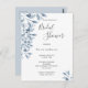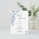 Ett trendig inbjudningskort för möhippan i vitt och dammblått. En vit chic på framsidan. Dekorerad med botaniska blåa färgader och löv. Modern stor, hanterad text, typografi med texten: Möhippa. Mallar för briden som ska vara namn och party. Mörk grått text. Baksida: dammig blå bakgrund. Tips! Om du inte vill att det ska se ut som ett vykort klickar du på anpassa, går till baksidan och tar bort delaren och lägger till frimärke.