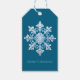 Blå vit snöflammande jul presentetikett