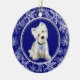 På framsidan av denna julprydnad är en vacker vattenfärgbild av en vacker Väster Highland White Terrier. Westie bär en blå halsband med en snöflingande märkre hängande från den. Bilden placeras på en royal blå cirkel som ramas av ett vitt snöflinga mönster på en matchande blå bakgrund. Baksidan av dekorationen har samma bakgrund och cirkel med anpassningsbarna vit.