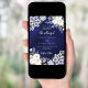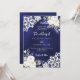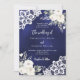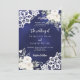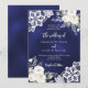 För ett elegant och romantiskt bröllop. En marinblå, ojämnt färgad bakgrund dekorerad med vita blommor, rosor och vit spets. Personifiera och lägg till era namn och detaljer.
