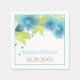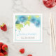 Fintvätt av blåa blommor blommigt vår bröllop papper napkin med vackra blommor i blått, akvatiskt, turkos och marint blått, löv i grönt och text i grått. Denna elegant och moderna utformning är en del av en uppsättning bröllop och är en perfekt med en fullkomligt anpassade för en vår eller sommar bröllop, möhippa, mottagning, förlovning eller årsdag party.