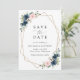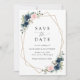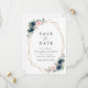 Vänner och familj i inbjudan i stil och ange tonen för din speciella dag med den här charmen spara datumkortet. Konstruktionen har blommor med marin och rosa, grönt och guld ram på vit bakgrund.