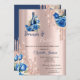 Elegant chic vin flaska med blått rosor och ro guld glitter med ro guld som bakgrund.