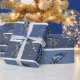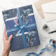 Blåa fjädrar på blå och vita ränder presentpapper