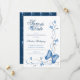 Sprid vingar och sår med den här känsliga femininindesignen. Blå fjärilar baserade på ett foto av en blå morfo-fladder över pappra. Silver vågar med glitter struktur vävar genom organiska blomningar som en bryggning. Den omvända sidan har en marin blå kontrast från den vita fronten och har en fjäril och blomster mönster. Perfekt för quinceañera firande, sweet sixteen, party eller något ungt dam som fyller år.