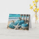 En samling av blåpumpor med turkos på en sandstrand med en väderstav av trä under en födelsedag. Text kan ändras.