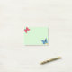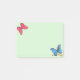 Post-it-lappar med söta röda och blå fjärilar och tre guldmetallic utseende konfettiprickar på ljusgrön bakgrund.
