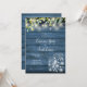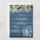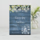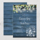 En chic landsbygd bröllopsinbjudan med vackra slingrande ljus, murar och naturliga färska eukalyptusblad grön bladverk, som ramar in dina bröllopsdetaljer i elegant skrift och klassisk typografi på en blå rustik träbakgrund. Designad av Thisisnotme
