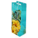 Tropiska hibiskusblommor och blad hög vinpåse. Anpassa med text på framsidan. Aqua blå vågor design med gula blommor och djungelblad som sveper runt påsen. "Tack för att du är här" är exempeltexten, i vit skrivstil. Använd som bröllopspresent, shower eller förlovningsfestgåvor.