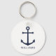Modern minimalistisk nautisk nyckelkedja med marint blåankare med personlig namn i marint blått modernt sans serif-teckensnitt stil på vit bakgrund.