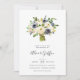 Elegantens inbjudningar till blommigt- och bärbröllop innehåller en bukett av vattenfärgblommor i chicens skuggor av indigo-blått och elfenben, med vibrerande löv och stammar av grönt. Anpassa med dina bröllop-detaljer under i en chic med block-, serif- och handskrivna calligrafteckensnitt.