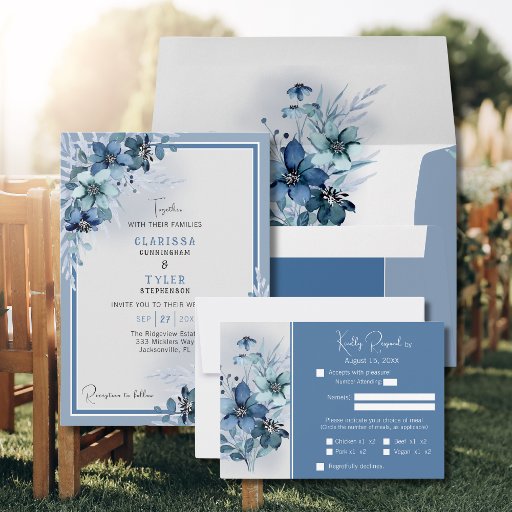 Söt Blue blommigt bröllopsinbjudan, lätt uppdaterad med dina uppgifter.