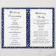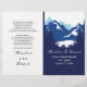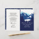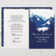 Blåberg och barrträd, uppfällt bröllopsprogram. Ett trendig till elegant bröllop-design med ett bergsområde genom barrträd och namn i handskriven stil. Insidan innehåller blått och vitt gräns med polka dots och vitt ramar med texten.