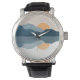 Abstraktens färgstarka illustration av soluppgången med blå berg i sjö