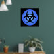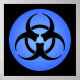 Svart biofarosymbol på cirkulär blå bakgrund.