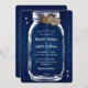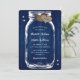 Rustic navy Blue bröllopsinbjudan med en mason burk och burlap-hjärtan på en lada-träbakgrund. Anpassa enkelt den här bröllopsinbjudan till Mason burk med dina bröllop-uppgifter.