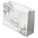 En vit chic bakgrund. Dekorerad med en ljusblå vattenfärgad rosesblomma, blommigtar, grönt eucalyptus löv, sprig, grönsak och faux guld sprigs. Anpassa och lägg till ett namn. Namn är skrivet med ett modernt handskript i stil.