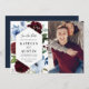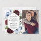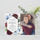 Tröghetsblå och burgunda vattenfärgblommor med skript och foto av paret. Färg och textdetaljer kan vara personlig.