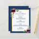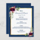 Ett elegant bohemian boho stil bröllop-menykort. Fjädrar och spola vattenfärgad ro i burgundi. Mallar för namn, datum och bröllop-menyn. Ett faux guld ram och en chic marin blå och vit bakgrund. Brev för marin blå färgad. Baksida: marin blå bakgrund.