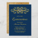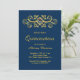 Sug med den här eleganten Quinceañera-inbjudan med en vacker, blomstrande design på blå bakgrund. Lägg bara till din händelseinformation i den här mallen som är enkel att använda för att göra den till en inbjudan av typen en. Vänd kortet över för att visa en faux guld glitter struktur på baksidan av kortet.