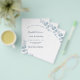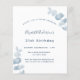 Observera att inbjudan är papper och mycket tunn. Kuvert ingår inte. Om du vill ha mer omfattande inbjudningar (samma design) kan du besöka vår butik. En vit bakgrund, dekorerad med mörkblå eucalyptus-stammar, spriggar. Anpassa och lägg till information om namn och party. Baksida: dammig blå bakgrund.