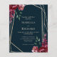Anpassadets prisvärda pappra bröllopsinbjudan i djupt marint blått. Har söt blommigt-buketter i djup rik, burgundära toner, med ett modernt guld geometriskt ram.