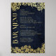 Vi presenterar en fantastisk meny om marinblått bröllop pub med en liten finess. Den här designen är försedd med graciös typografi och invecklade gyllene snurrar, och den förkroppsligar och sofistikerar i harmoni mellan perfekter.