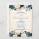Den vackra blommigten boho rustic land lada-bröllopsinbjudan innehåller handmålad blommigt/ro i rik-toner av marinblå och rosa/persika och charmering av stil-typsnitt.