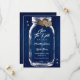 Personlig marinblått rustiskt myntkort burk bröllop spara datum med en mason burk och brännhjärtan mot en lada med baksida av trä i lada med ljus. Anpassa enkelt onlinen. Matchningsartiklar som är tillgängliga för att komplettera dessa Mason burk bröllop spara datum.