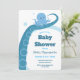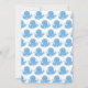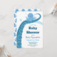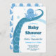En inbjudan till babydusch med en leende, blå, bläckfisk karaktär. Den lilla bläckfisken hålls upp av arm i en större bläckfisk. Baksidan av inbjudan visar en mönster av små bläckfiskar. Hela ord kan anpassas.