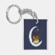 Skär lite knubbig brunt uggla sitta på måne med stjärnor i en blå bakgrund.