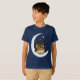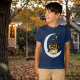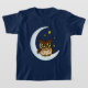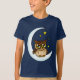 Ett sött litet knubbig brunt baby uggla sitta på måne med stjärnor överallt i blått sken