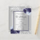 Faux silver tittar bakgrund med marinblå och ljusblå blommigtar, blommor och faux silver glitter, gnistor. Anpassa och lägg till information om namn och bröllop. Black brev.