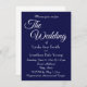 Enkel stil, bröllopsinbjudan som innehåller en trendig, marin blå färg-bakgrund tillsammans med framtida brid och groom namn och händelsemedatum, tid, plats och register tryckt i vitt, stiliserat skript. Anpassa din bröllopsinbjudan genom att ersätta information med din egen. Markera inbjudan papper stil och kvantitet. Designad för samordning med vår insamling av blått enkelt Stil Bröllop.