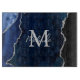 Den här styckningsskivan har en elegant och en glamorös marmorbakgrund med geode gemstone-detaljer och faux silver glitter-accents. Monogrammet kombinerar handskript och modernt sans serif typsnitt för ett klassigt och sofistikerat utseende. Detta kommer att bli den idealiska presenten eftersom den kan anpassas med namn och en början. De djupblåa nyheterna gör det till perfekt för höstfall och vinter.