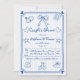 Blåblå och vit manlig, vismisk Fransk stil bröllop par duschinbjudan. Den här handritade inbjudan är perfekten för att tillkännage din möhippa, med en viskös, Fransk stil. Utformningen är ett vackert samspel mellan blått och vitt, med lekfulla mantelvinklar, ett ring och en båge som ställs mot blekens blå och vita rand. Det handskrivna teckensnittet och den charmerande hjärtslitande ram tillför en sista elegans till denna unika inbjudan.