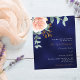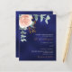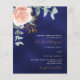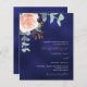 En marin blå färgad bakgrund. Den blå färg är ojämn. Dekorerad med en blommigt för guld och rosa, blomma från ro och grönt, vattenfärgad eukalyptus löv, sprig, grönsak och faux ro sprig. Anpassa och lägg till namn och information. Vit och guldfärgad färgad. Bakåt: Tungt blå, ojämn färgad. 1 lakan = 1 inbjudan tryckt kant till kant.