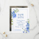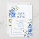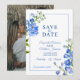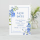 Vackra delphinium-spiken målade blå botaniska konst och foto på omvänd bröllop spara datum inbjudan. Redigera det här alternativet om du vill spara datumkortet bröllop med ett eget ord och ett speciellt foto. Sarah Trett har en unik utformning och har en originalfärgad panoramabilt som målas med panoramat i bran och som endast är avsedd för www.mylittleedenweddings.com på Zazzle.