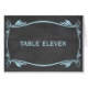 Elegant och trendig Mourish Chalkboard-Bordsnummer-kort med en krita och en finare-snurra och löv art deco gräns i ljusblå form. Enkel att anpassa, lägg helt enkelt till rätt bordsnummer i den text fält tillhandahåller. Klicka på Anpassa om du vill söka efter fler anpassningsalternativ.