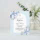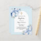 En vit båge ram och ljusblå bakgrund. Dekorerad med blå och vita blommor och bögar. En gyllene kor. Anpassa och lägg till namn och detaljer. 1 lakan = 1 inbjudan tryckt kant till kant.